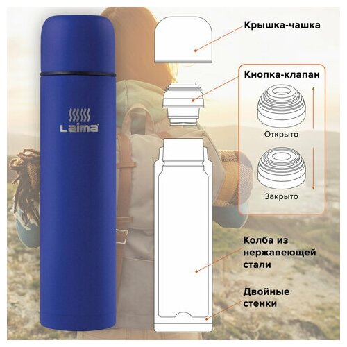 Термос LAIMA классический с узким горлом, 1 л, нержавеющая сталь, синий, 605124 - 1 шт.
