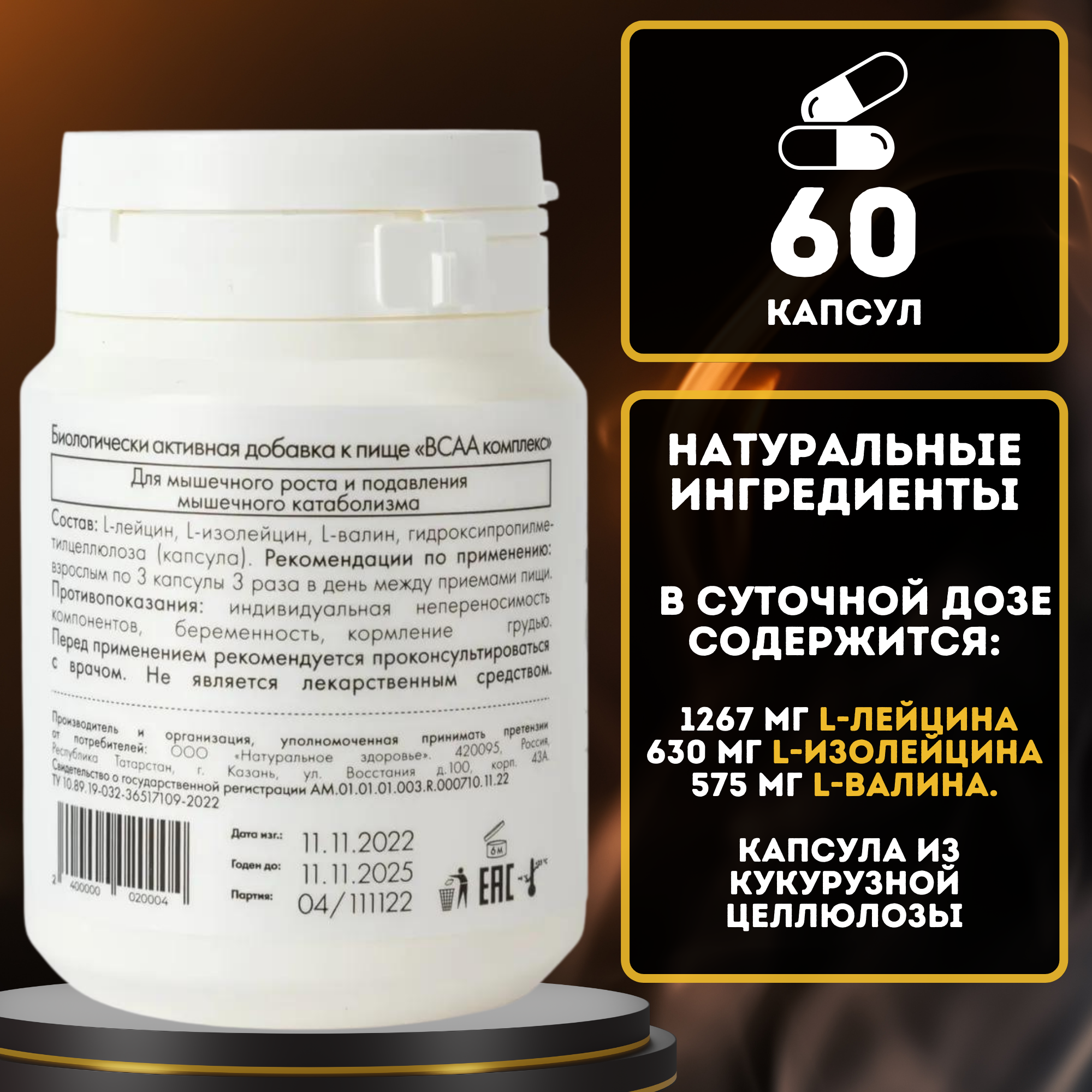 Аминокислоты Аминокислоты BCAA 2:1:1 / БЦАА, 60 капсул. Спортивное питание для мужчин и женщин, витамины для мышц и мужского здоровья. Natural Health / Натуральное здоровье