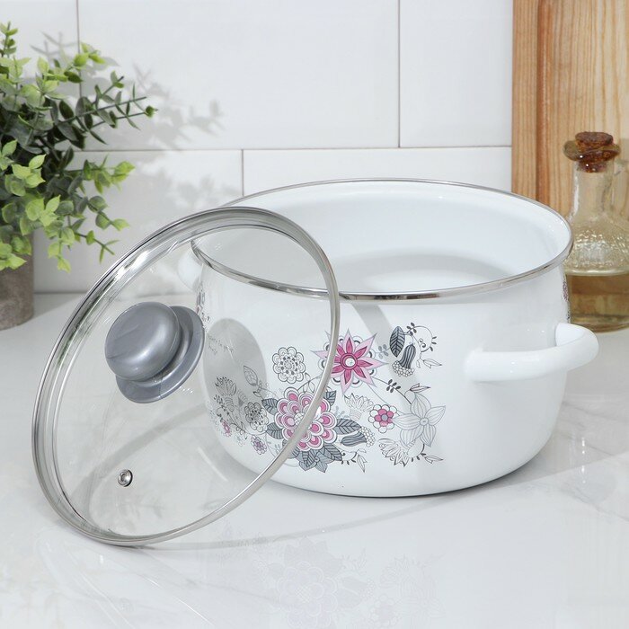 Лучшие цены. Кастрюля «Весенний романс», 4 л. Эмалированная кастрюля отлично подходит для приготовления и хранения различных блюд. Традиционный инструмент пригодится дома и на даче.Особенности:крышка ускоряет приготовление пищи,внутренняя поверхность безопасна для продуктов питания,удобные ручки,приятный дизайн.Рекомендуется избегать использования высокоабразивных моющих средств и железных губок.(2850669). Магазины в вашем городе.