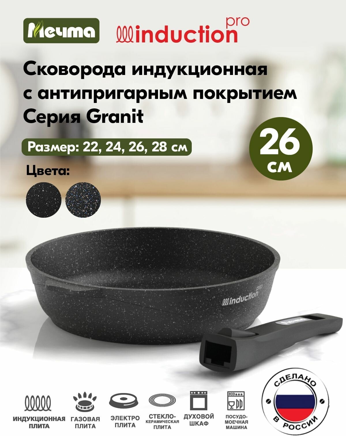 Мечта Сковорода Гранит black. Induction Pro, d26 см, съёмная ручка, антипригарное покрытие
