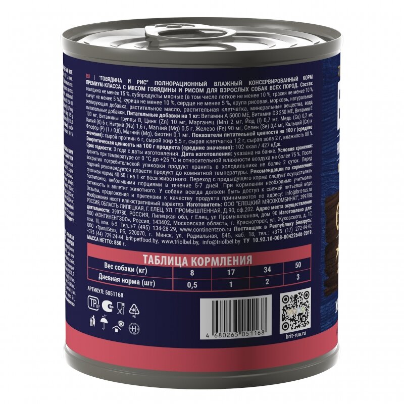 Brit Premium 12шт по 850г с говядиной и рисом консервы для взрослых собак всех пород