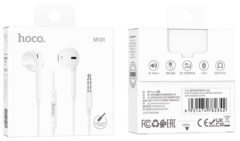 Наушники M101, Crystal joy wire-controlled earphones with microphone, HOCO, белые