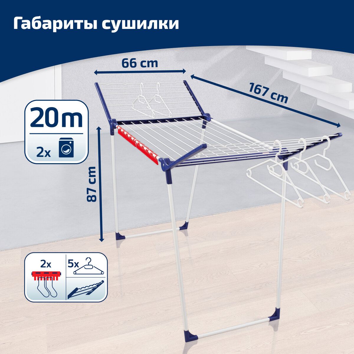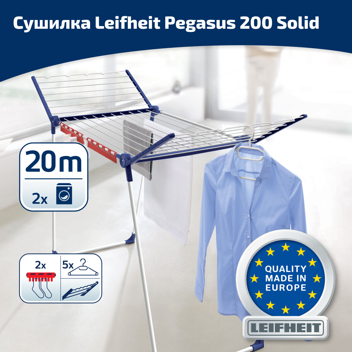 Лучшие цены. Сушилка для белья Leifheit Pegasus 200: - рабочая длина 20 м; - подходит для сушки белья, одежды и мелких предметов; - максимальная длина сушилки в разложенном виде 167 см; - подходит для 2 загрузок стиральной машины; - в сложенном виде занимает мало места; - сушилка устойчива благодаря двум параллельным ножкам; - подходит для сушки изделий длиной до 107 см; - устойчива к ржавчине; - в комплекте держатель для мелких предметов и 5 вешалок; - волнообразная боковая рейка надежно фиксирует вешалки. Магазины в вашем городе.