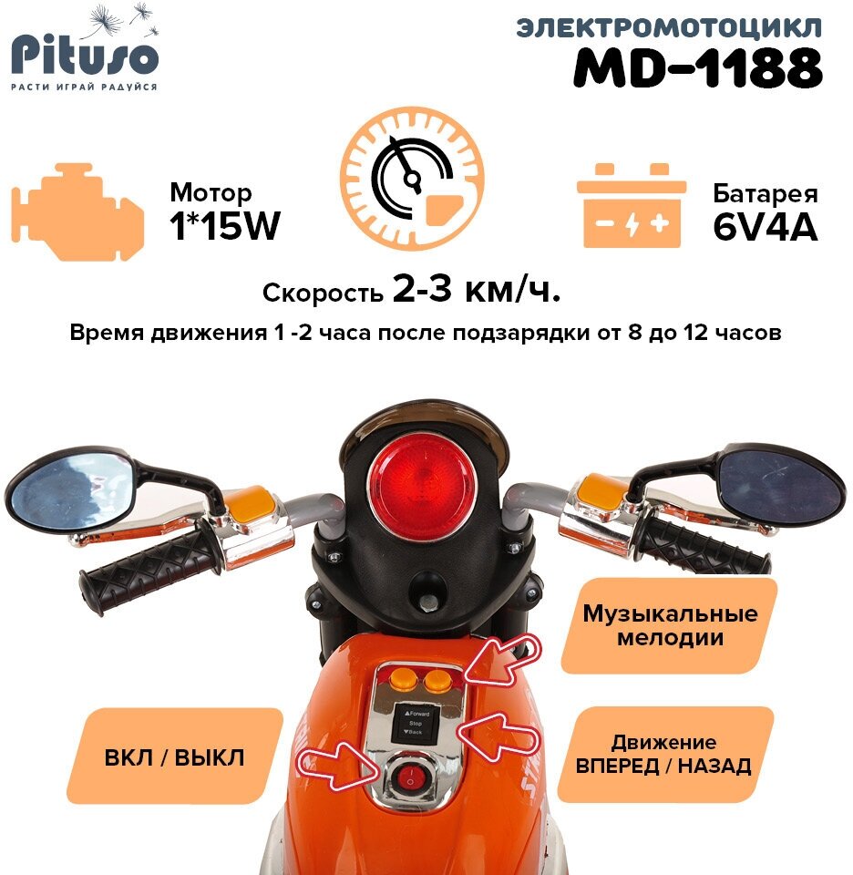 Электро-мотоцикл Pituso 1188 оранжевый Детский электромотоцикл электро-трицикл электромобиль подарок для детей для мальчиков для девочек