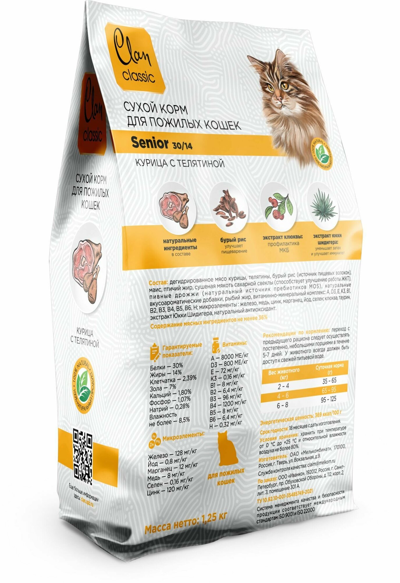 [130.4.718] CLAN CLASSIC Senior-30/14 курица/телятина 1,25кг для кошек пожилых , 130.4.718