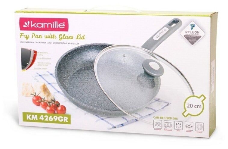 Лучшие цены. Сковорода 20 см с крышкой и гранитным покрытием из алюминия Kamille KM-4269GR эксклюзивное предложение нашего интернет-магазина. Благодаря прочному гранитному покрытию, такая сковорода устойчива к механическим воздействиям, за счет чего значительно увеличивается срок ее службы. **Сковорода** нагревается равномерно, не создавая перегретых участков и холодных краев, даже в тех случаях, когда процесс приготовления еды идет на небольшом огне. Магазины в вашем городе.