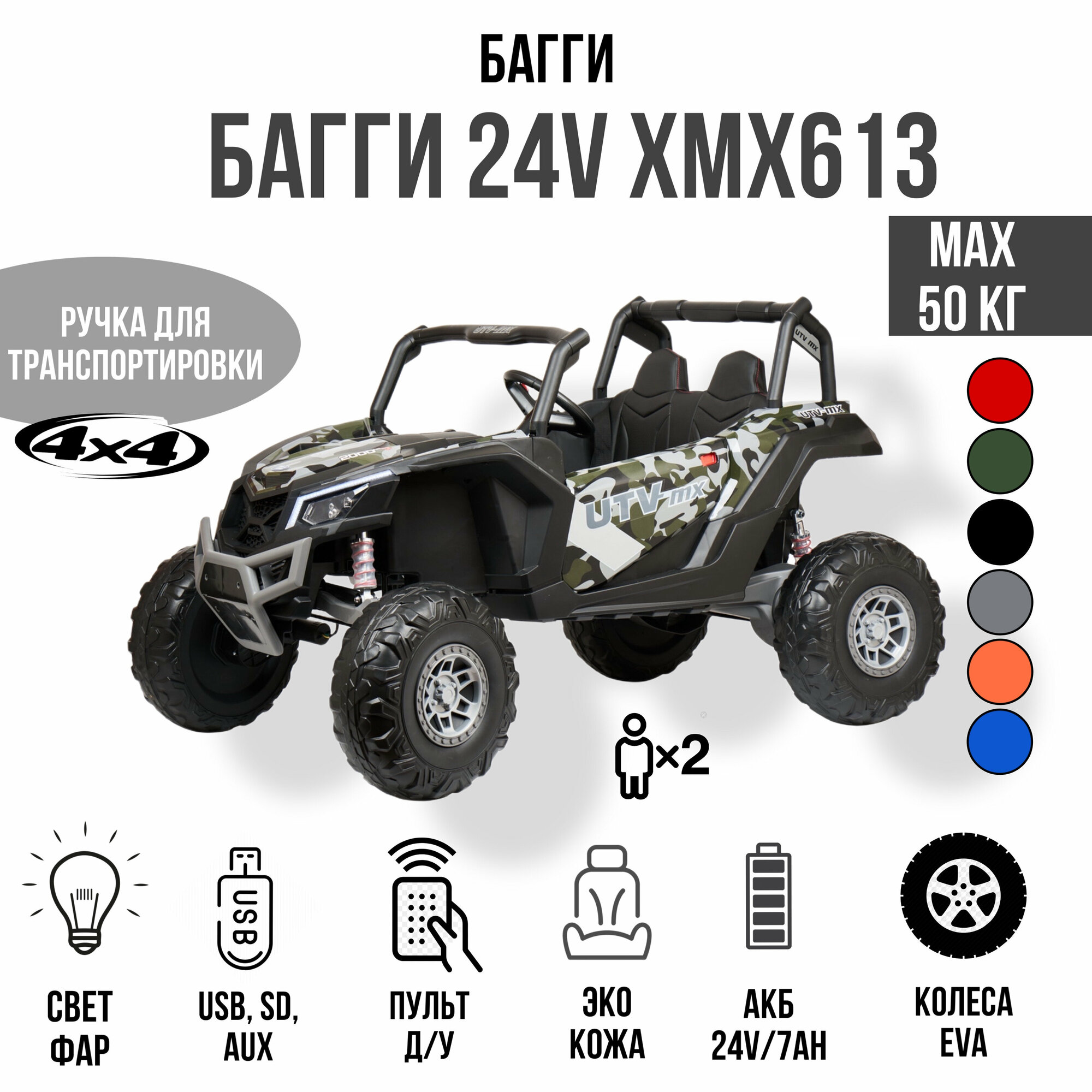 Лучшие цены. Детский багги 24V 4х4 ХМХ 613 для ребенка от 1 года до 7-8 лет или для двух детей до 4-5 лет. Два посадочных места (руль смещен в левую сторону для удобства водителя). Детский электромобиль Багги 24V ХМХ 613 - полноприводный внедорожник с современными техническими характеристиками. За счет прочного каркаса кузова автомобиль может выдерживать нагрузку до 50 кг. Плавность движения автомобиля по любой дороге создается с помощью амортизаторов на передних и задних каучуковых колеса. Магазины в вашем городе.