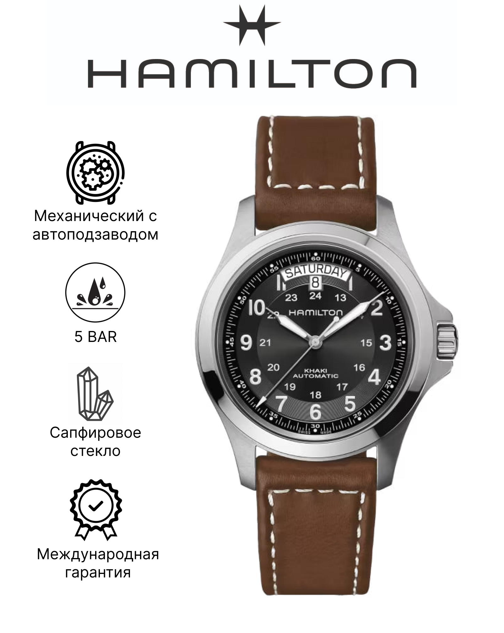 Наручные часы Швейцарские механические часы с автоподзаводом Hamilton Khaki King Auto H64455533 на кожаном браслете, с водозащитой 5 бар и международной гарантией от производителя