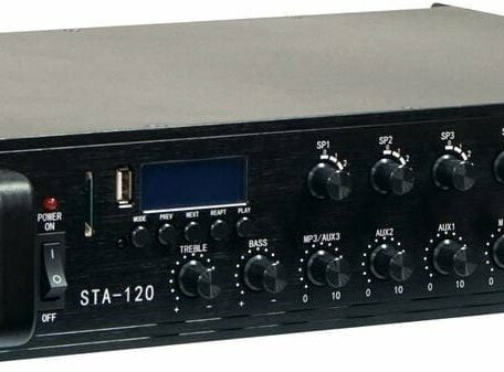 Лучшие цены. Микшер-усилитель на 6 зон, мощностью 120 Вт. 70/100 В, возможность низкоомного подключения (8 Ом). MP3 плеер: WMA, USB, SD, BLUETOOTH, FM. Макс. объем флэш накопителя 16 Гб. Аудио входы: 3 х MIC, 3 х AUX. Область применения - системы Public Address, фоновая музыка и речевое оповещение в торговых и офисных помещениях, кафе и небольших ресторанах, на заправочных станциях, в гостиницах и отелях. Магазины в вашем городе.