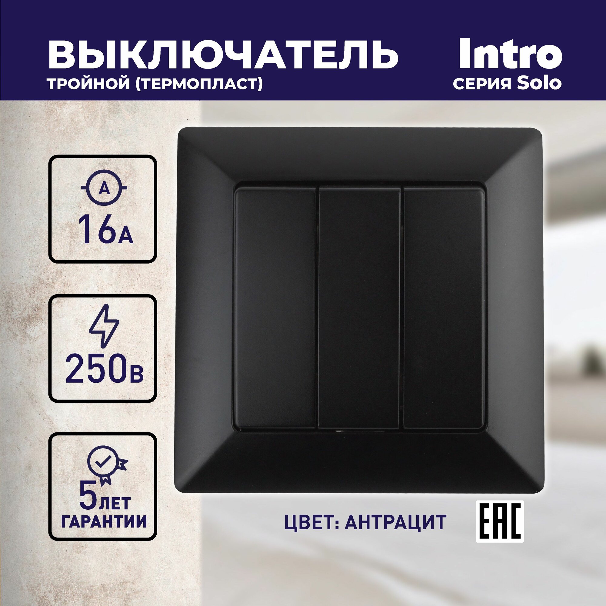 Intro 4-106-05 Intro Выключатель тройной, 10А-250В, СУ, Solo, антрацит (10/200/2400)