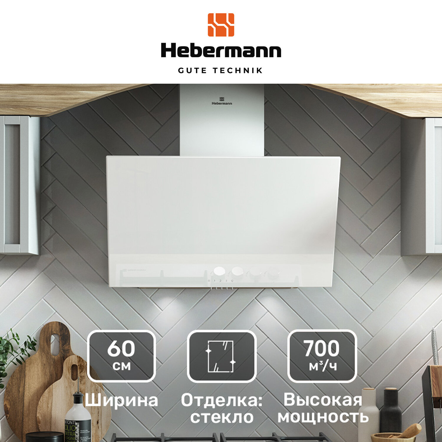 Вытяжки Наклонная кухонная вытяжка Hebermann HBKH 60.4 W, 60 см, белая, кнопочное управление, LED лампы, отделка- окрашенная сталь, стекло