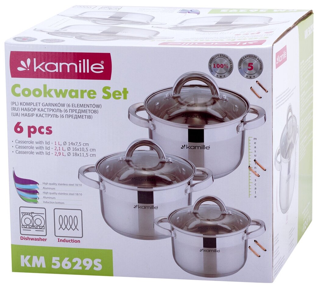 Кастрюли Набор кастрюль 6 предметов Kamille KM-5629S (2.5л, 3.8л, 6.5л; полые ручки) из нержавеющей стали