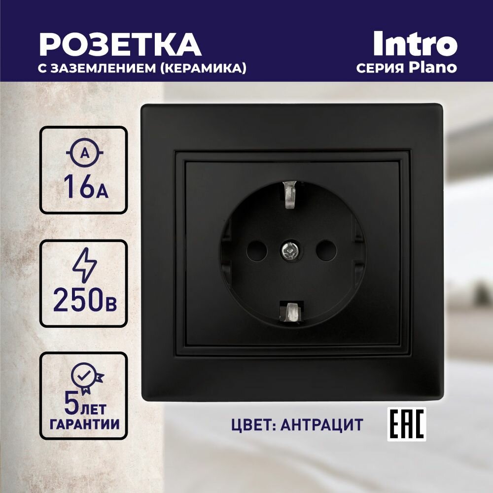 Розетка Розетка Intro Plano 1-202-05 с заземлением 2P+E Schuko, 16А-250В, IP20, СУ, антрацит арт. Б0053881 (1 шт.)
