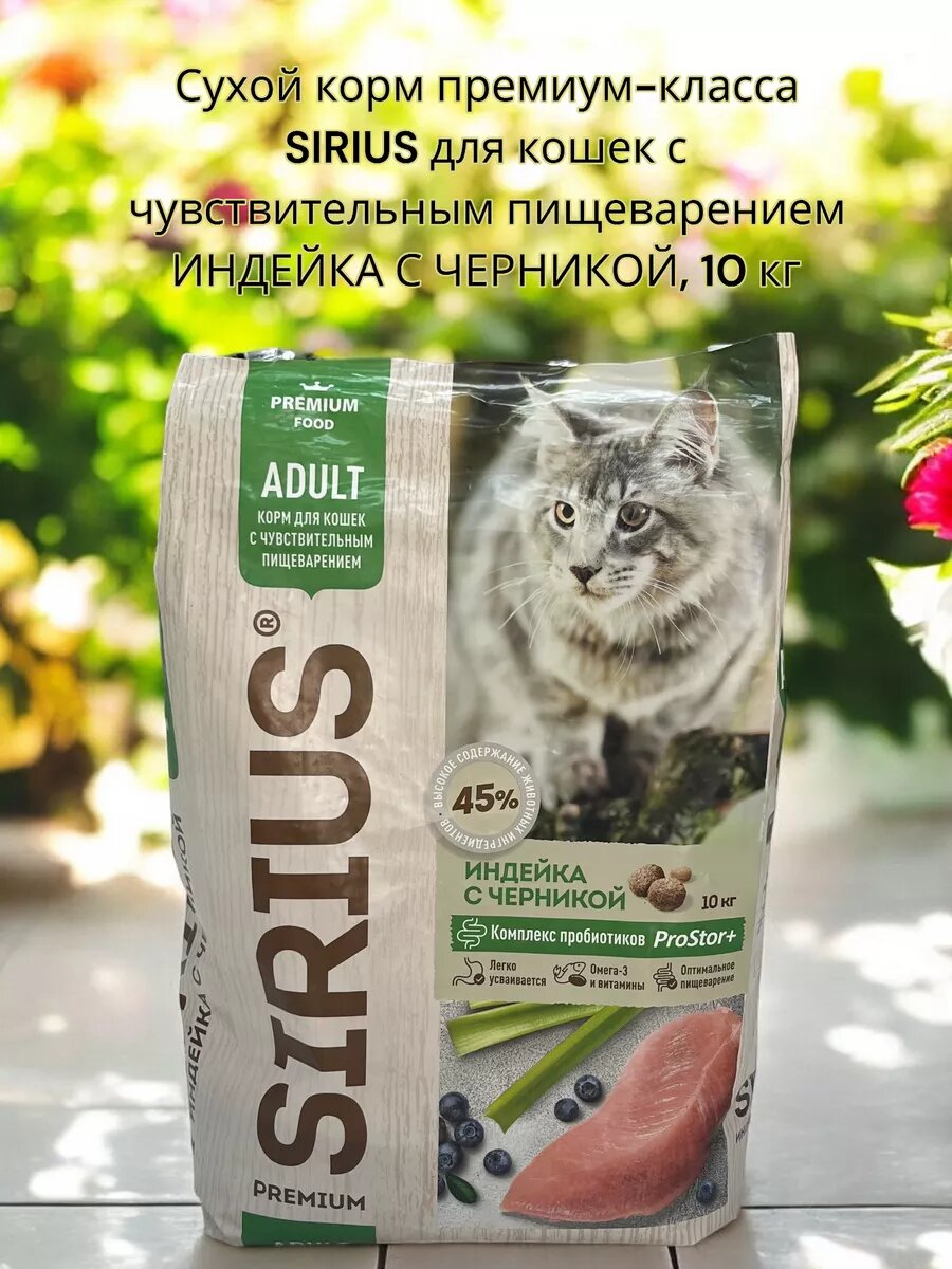 Сухой корм sirius для кошек с чувствительным пищеварением индейка и черника 10кг
