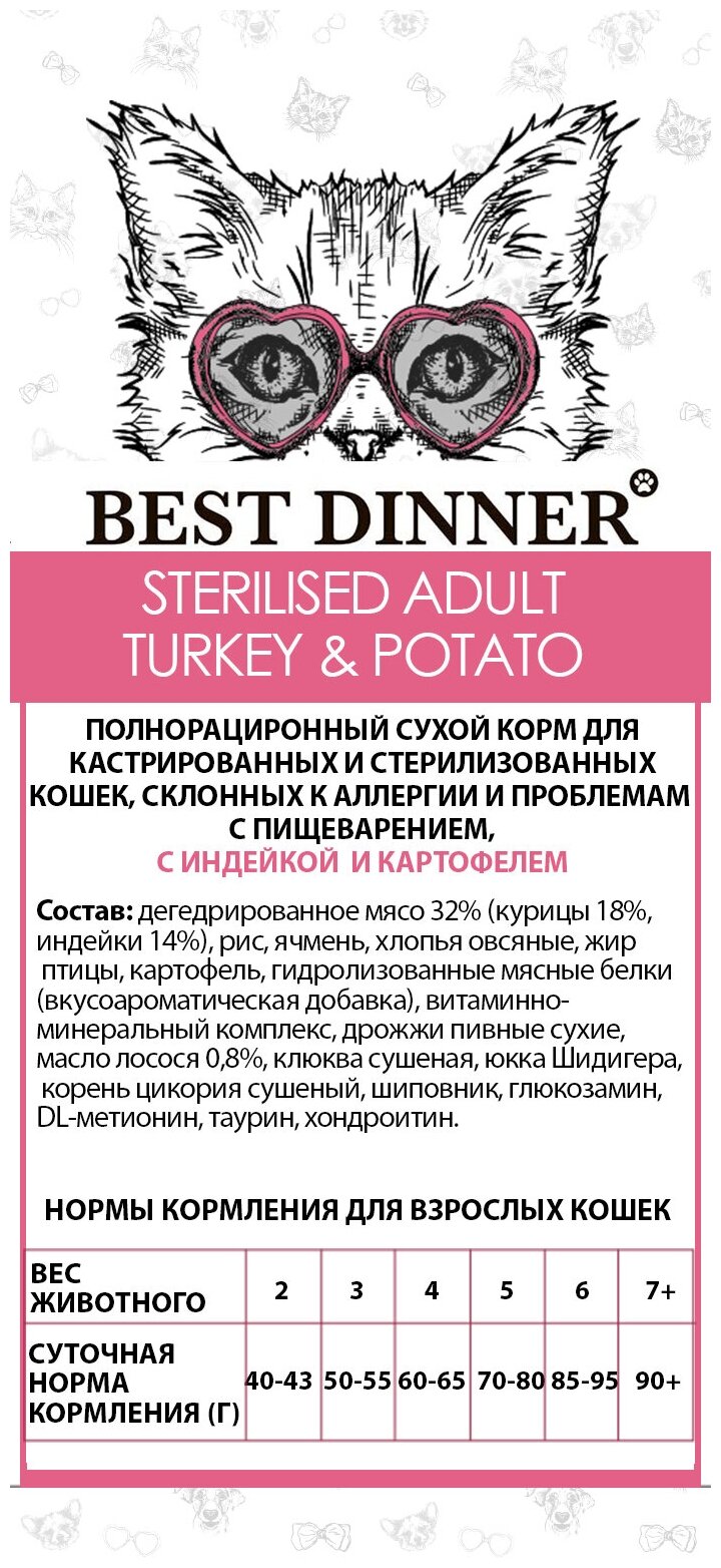 BEST DINNER CAT ADULT STERILISED TURKEY & POTATO для взрослых кастрированных котов и стерилизованных кошек с чувствительным пищеварением с индейкой и картофелем (0,4 кг)