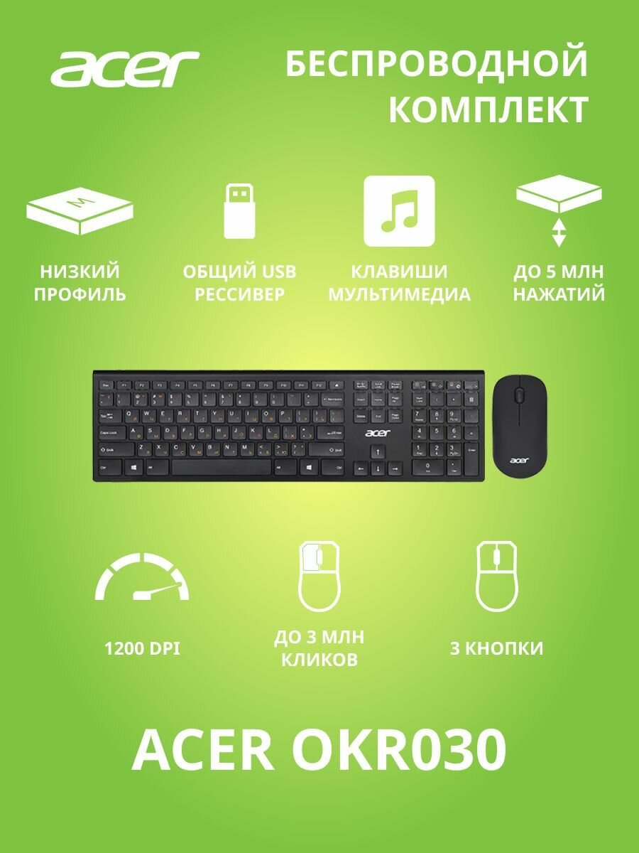 Клавиатура от компании Acer, модель OKR030, Цвет черный, Комплектация клавиатура и мышь и Тип подключения радио, а также Кабель / радиус 10 м.