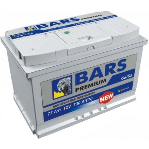Автоаккумулятор от компании Bars, модель Premium (6CT-77R), Тип стартерный, Назначение авто и Обслуживание обслуживаемый, а также Форм-фактор европейский.