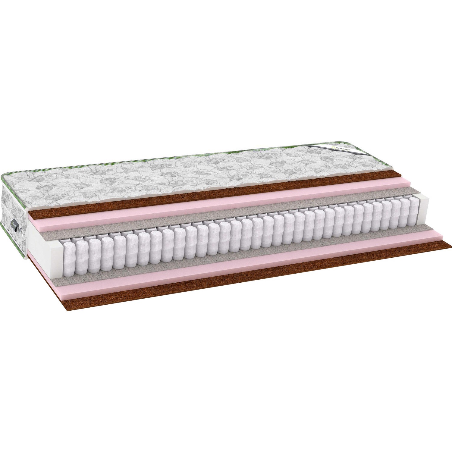 Матрасы от компании Bonato, модель Dzholli 180x190, Тип пружинный (независимый), Жесткость выше средней (4) и Количество слоев 7 шт, а также Наполнитель кокосовая койра, пенополиуретан, войлок.