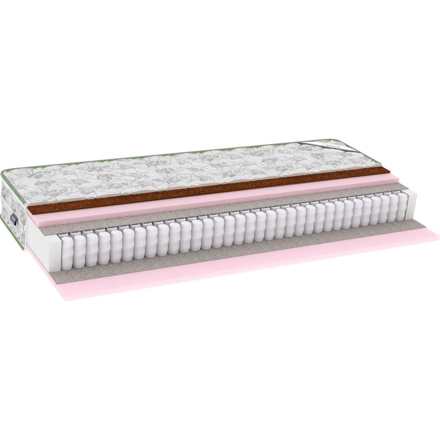 Матрасы от компании Bonato, модель Dzholli 1K 90x190, Тип пружинный (независимый), Жесткость средняя / выше средней (3/4), двусторонний и Количество слоев 6 шт, а также Наполнитель кокосовая койра, пенополиуретан, войлок.