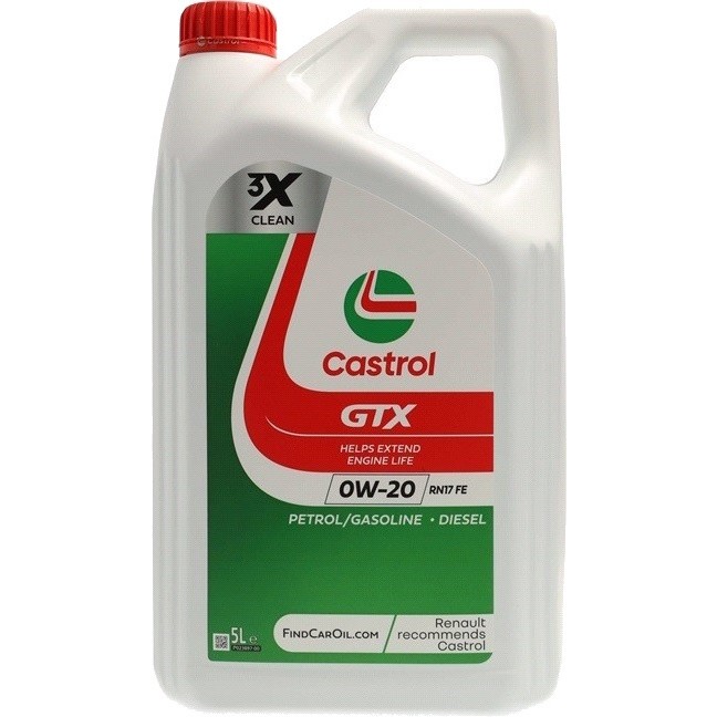 Моторные масла от компании Castrol, модель GTX 0W-20 RN17 FE 5L, Тип синтетическое, Двигатель бензиновый / дизельный и Объем 5 л, а также SAE 0w-20.