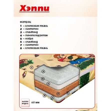 Матрасы от компании Come-for, модель Happy 80х200, Тип беспружинный, Жесткость средняя (3) и Количество слоев 2 шт, а также Наполнитель синтепон, спанбонд, пенополиуретан, кoкoсoвая кoйра.