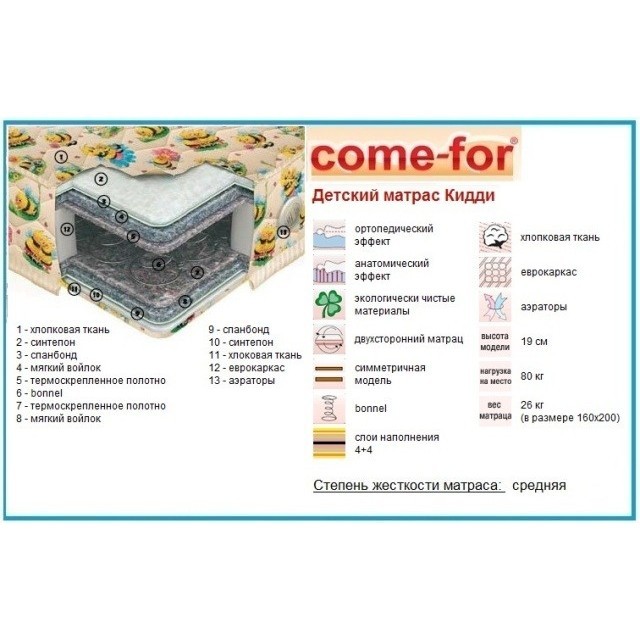 Матрасы от компании Come-for, модель Kiddy 140х200, Тип пружинный (Боннель), Жесткость средняя (3) и Количество слоев 5 шт, а также Наполнитель синтепон, спанбонд, войлок, термоскрепленное полотно.