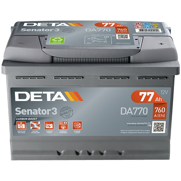 Автоаккумулятор от компании Deta, модель Senator 3 (DA456), Тип стартерный, Назначение авто и Обслуживание необслуживаемый, а также Форм-фактор азиатский.