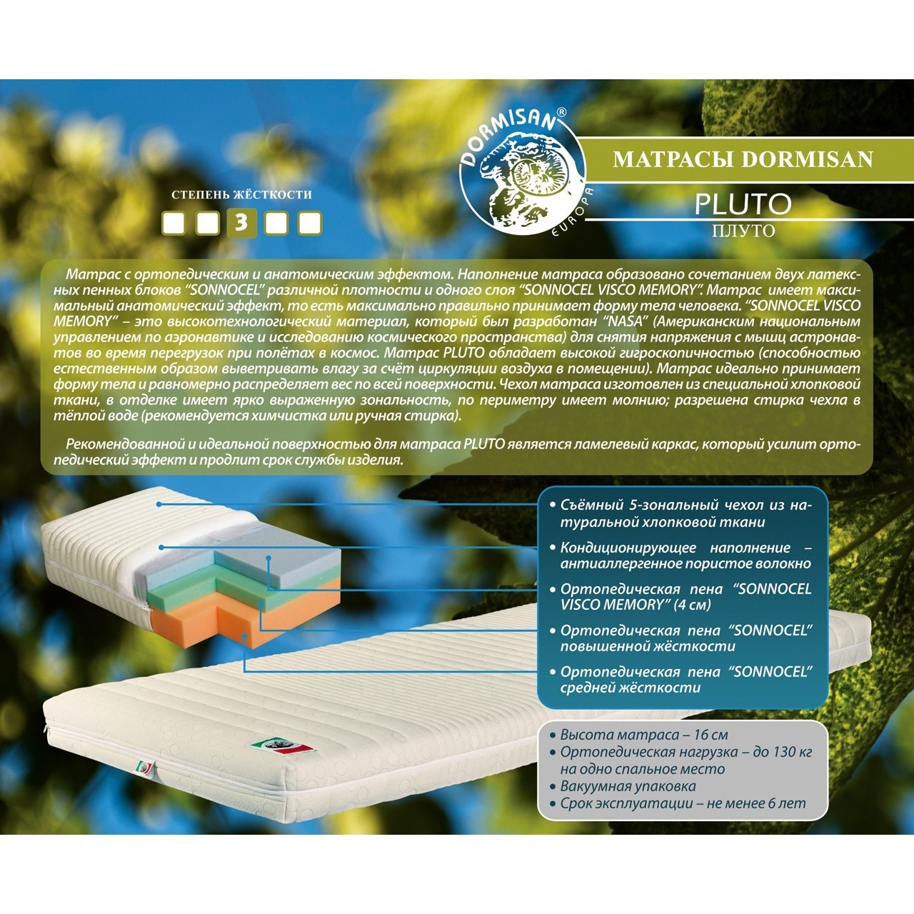 Матрасы от компании DORMISAN, модель Pluto 160х195, Тип беспружинный, Жесткость средняя (3) и Количество слоев 3 шт, а также Наполнитель пористое волокно, пенополиуретан, латекс.