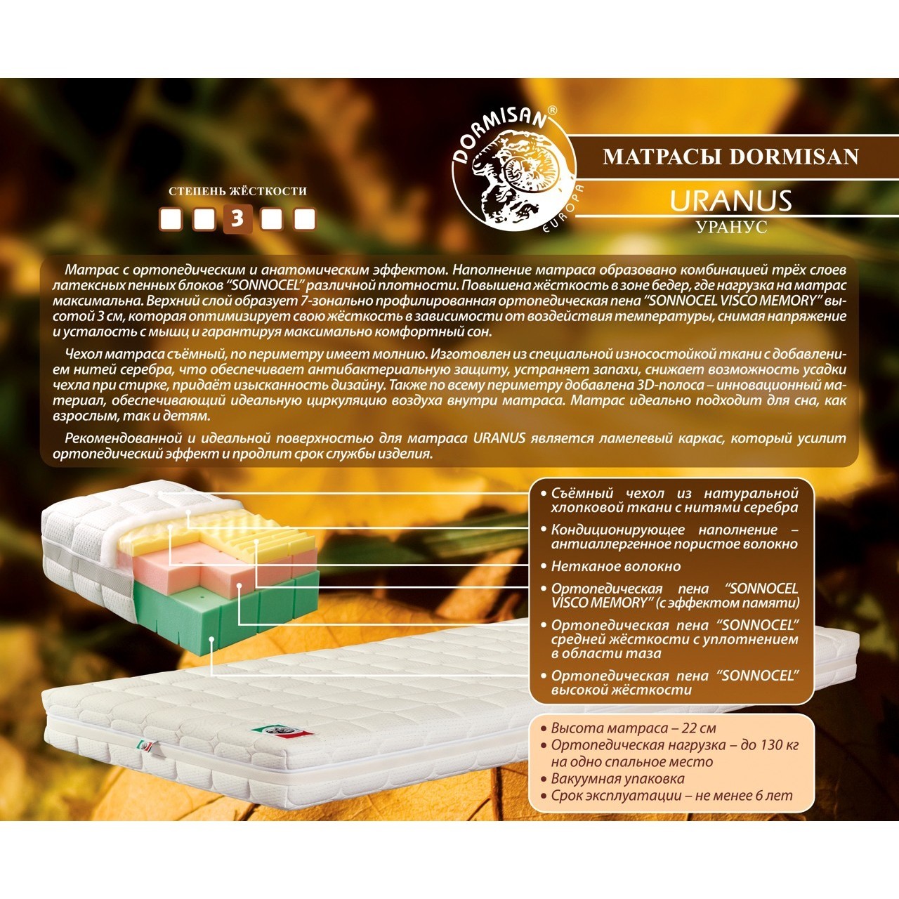 Матрасы от компании DORMISAN, модель Uranus 100х190, Тип беспружинный, Жесткость средняя (3) и Количество слоев 3 шт, а также Наполнитель нетканое волокно, пенополиуретан.