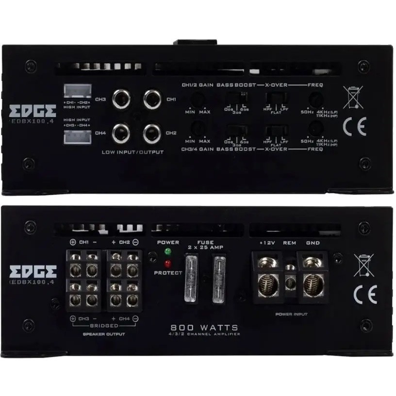 Автоусилители от компании EDGE, модель EDBX100.4-E1, Класс A/B, Количество каналов 4 и Ном. мощность канала (при 2 Ом) 100 Вт, а также Ном. мощность канала (при 4 Ом) 80 Вт.
