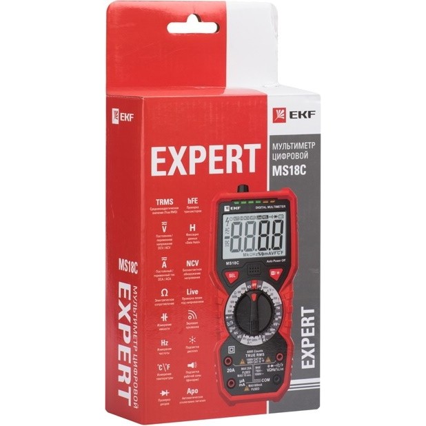 Мультиметр от компании EKF, модель Expert MS18C, Устройство мультиметр, Тип цифровой и Измерения напряжение / ток / сопротивление / емкость / температура / частота, а также Другие измерения бесконтактное обнаружение напряжения.