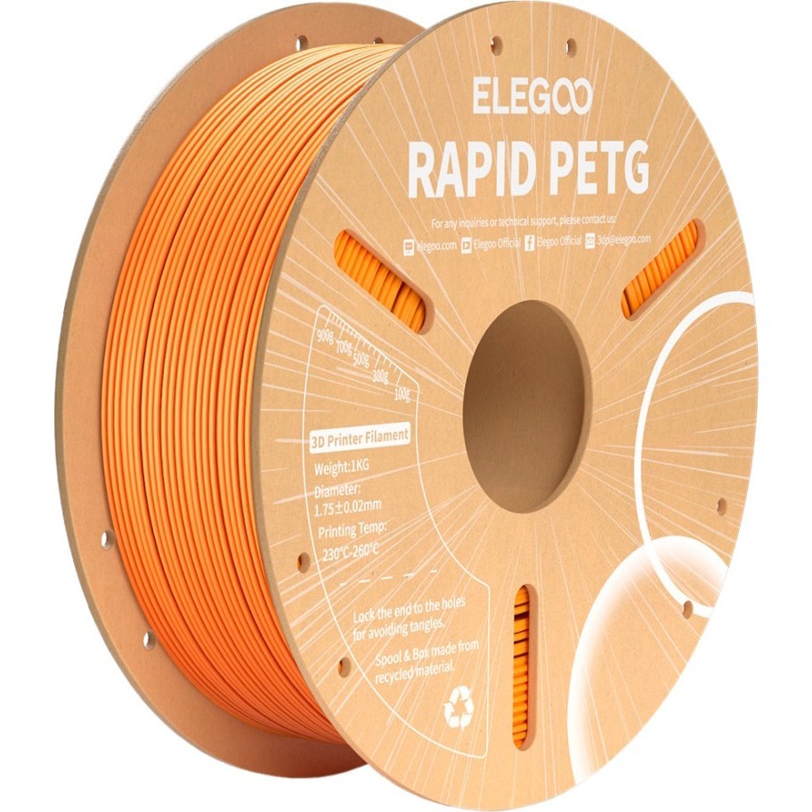 Пластик для 3D печати от компании Elegoo, модель Rapid PETG Orange 1kg, Материал PETG, Диаметр 1.75 мм и Длина 330 м, а также Скорость печати 30 – 600 мм/с.