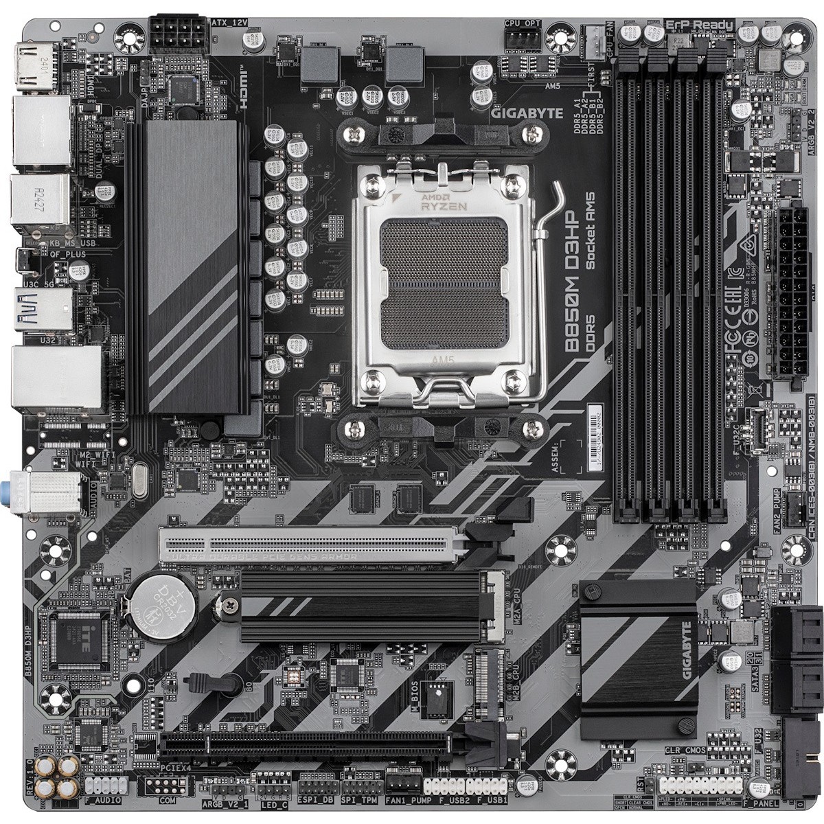 Материнские платы от компании Gigabyte, модель B850M D3HP, По направлению для дома/офиса, Socket AMD AM5 и Форм-фактор micro-ATX, а также Фазы питания 9 / 5+2+2 /.