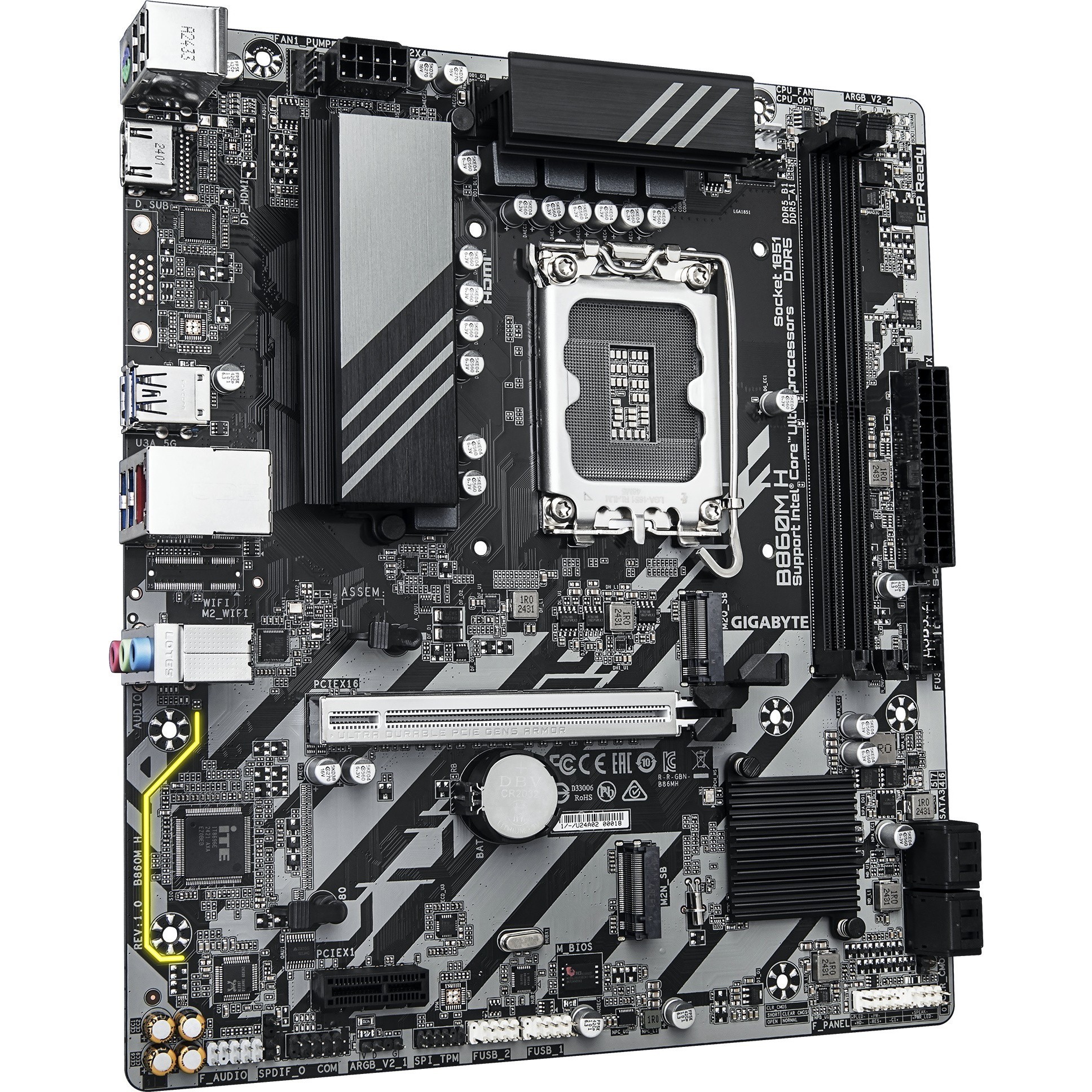 Материнские платы от компании Gigabyte, модель B860M H, По направлению для дома/офиса, Socket Intel LGA 1851 и Форм-фактор micro-ATX, а также Фазы питания 7 / 4+1+2 /.