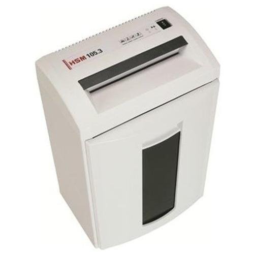 Уничтожитель бумаги от компании HSM, модель 105.3 (3.9), Уровень секретности (DIN 66399) P-2, Уничтожает степлерные скобы / канцелярские скрепки / пластиковые карты и Тип резки параллельная, а также Размеры фрагментов 3.9 мм.