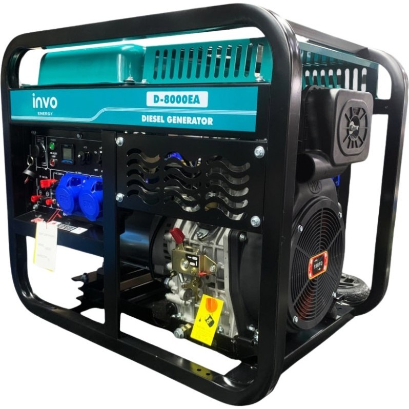 Генераторы от компании INVO, модель D-8000EA, Топливо дизель, Выходное напряжение 230 B и Номинальная мощность 7.5 кВт, а также Максимальная мощность 8 кВт.