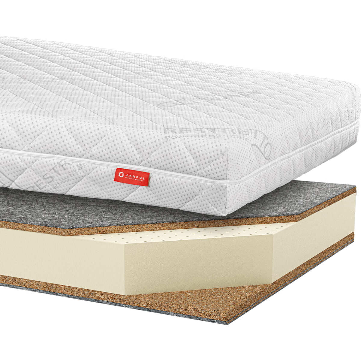 Матрасы от компании Janpol, модель Zeus 90x190, Тип беспружинный, Жесткость высокая и Количество слоев 5 шт, а также Наполнитель латекс, кокосовая койра.