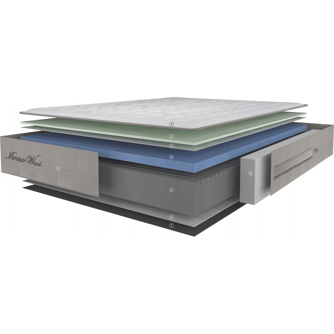 Матрасы от компании Karibian, модель Merino 200x200, Тип беспружинный, Жесткость средняя (3) и Количество слоев 5 шт, а также Наполнитель пена (Visco, Bio Viscosoja), пенополиуретан.