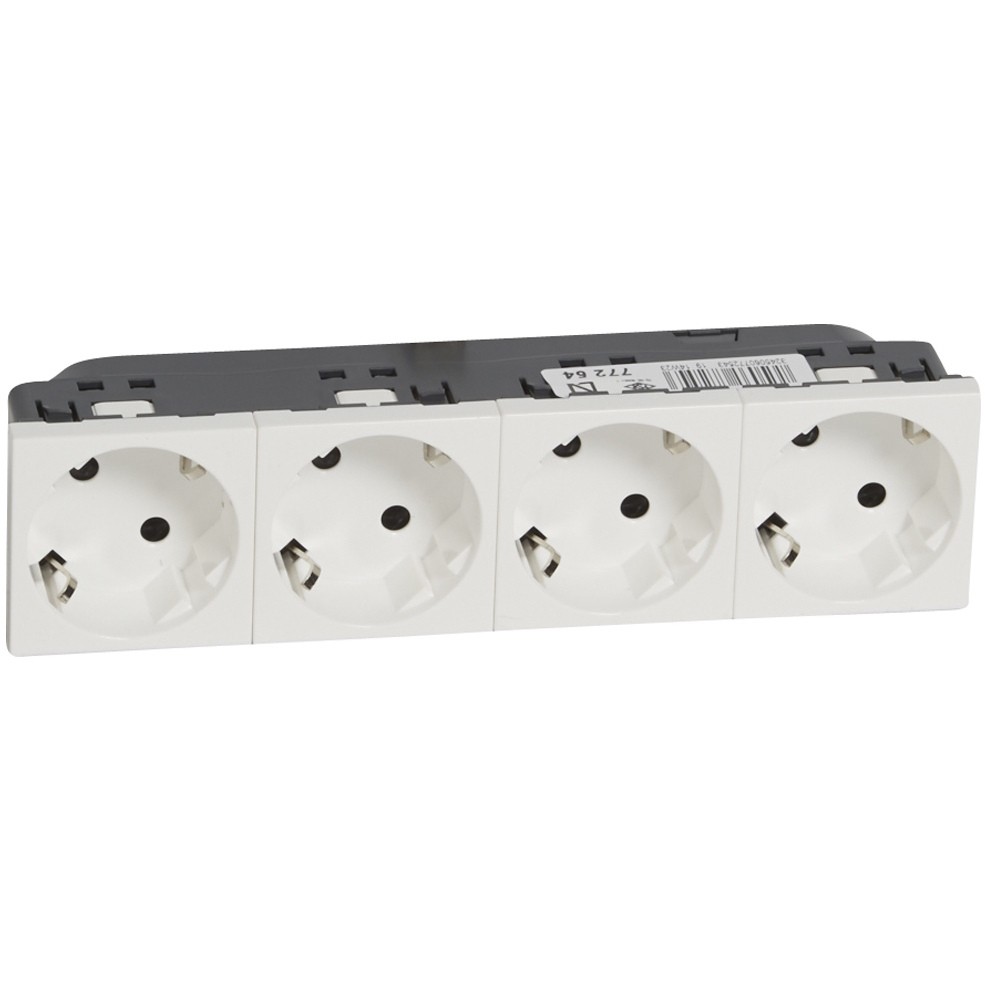 Розетки от компании Legrand, модель Mosaic 077254 белый, Назначение электрическая, Комплектация розетка без рамки и Установка в монтажную коробку, а также Возможность подключения 4 разъема.