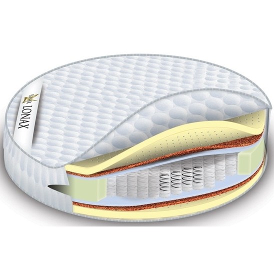 Матрас от компании Lonax, модель Round Medium TFK (D210), Тип пружинный (независимый), Жесткость средняя и Количество слоев 7 шт, а также Наполнитель латес, кокосовая койра, войлок.