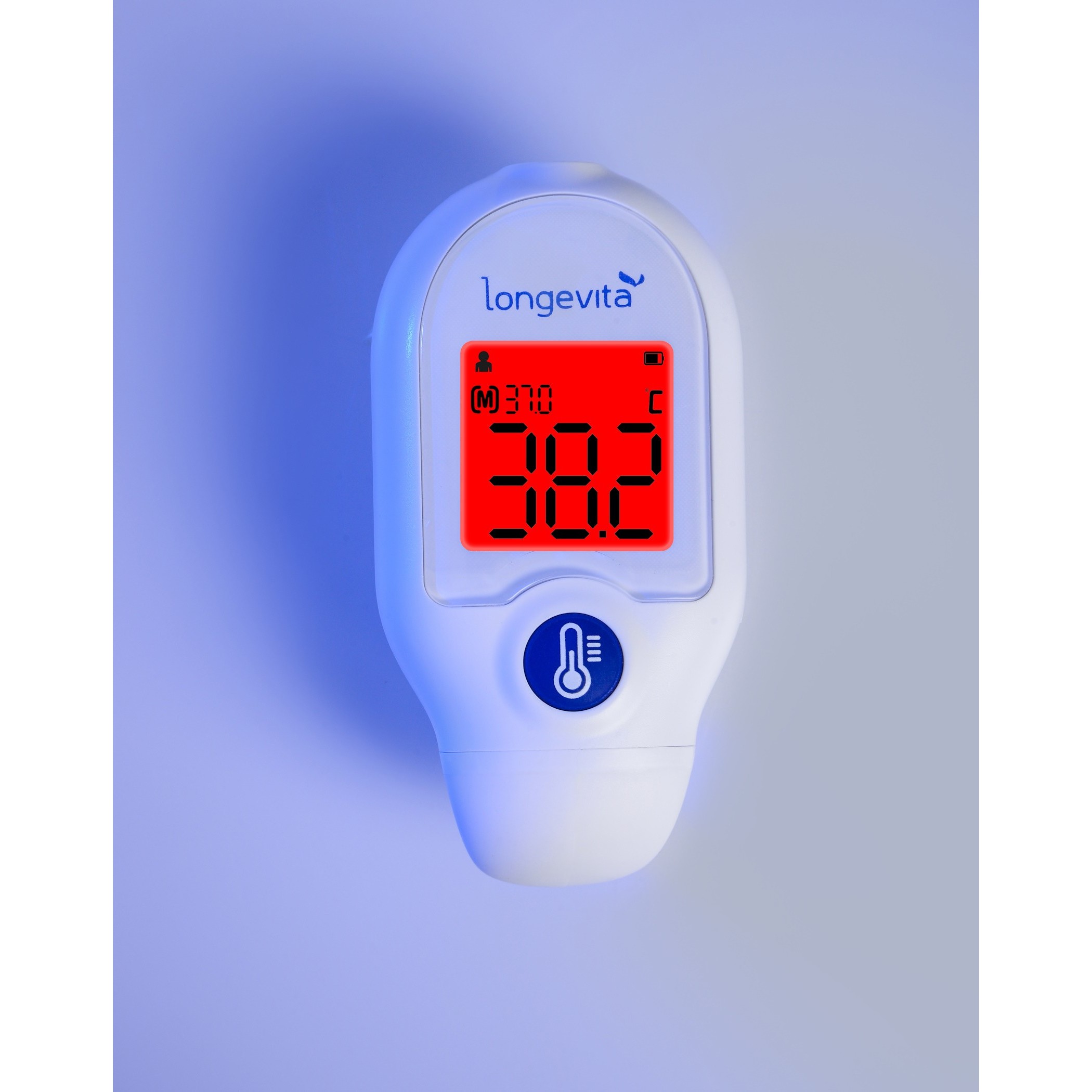 Медицинские термометры от компании Longevita, модель DET-3022, Тип инфракрасный, Область применения лобный и Продолжительность измерения 1 с, а также Диапазон измерения 0 – 100 °C.