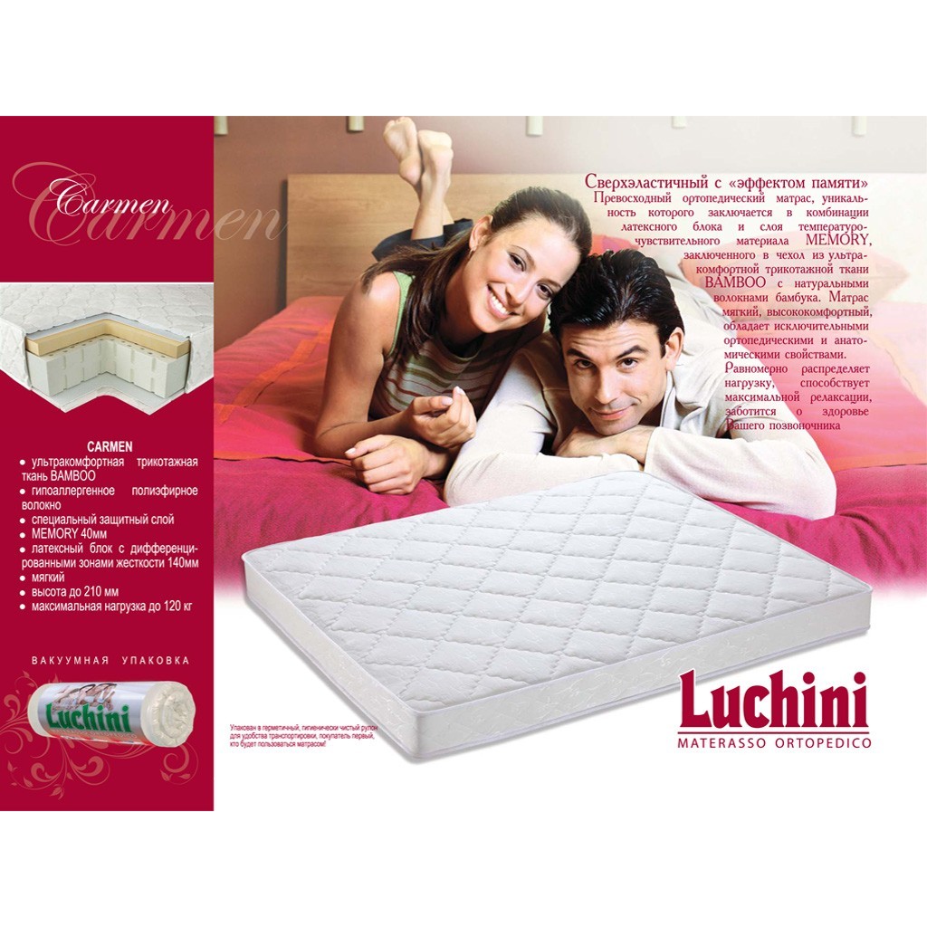 Матрасы от компании Luchini, модель Carmen 80х200, Тип беспружинный, Жесткость низкая (1) и Количество слоев 2 шт, а также Наполнитель полиэфирное волокно, спанбонд, пенополиуретан, латекс.