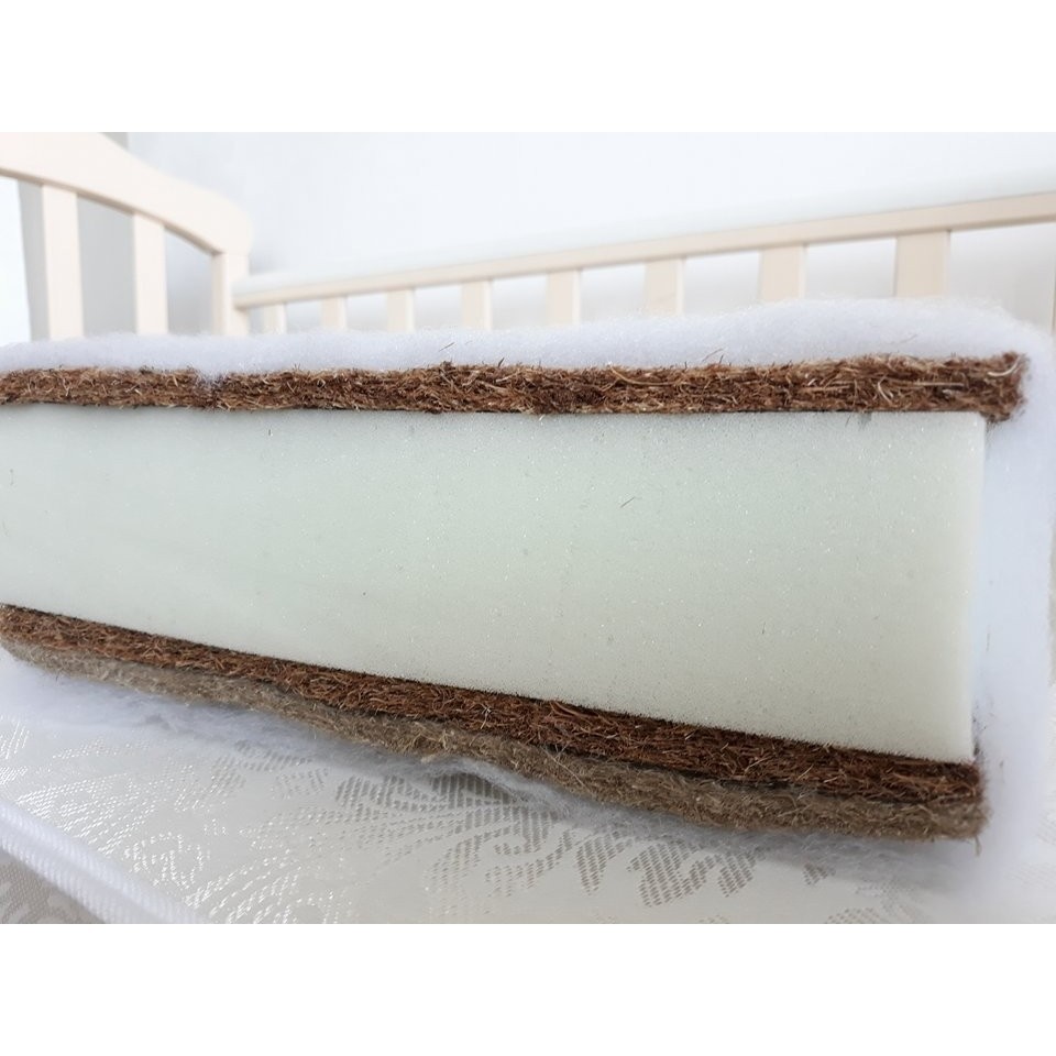Матрасы от компании Lux Baby, модель Junior Lon 20 140x190, Тип беспружинный, Жесткость выше средней (4) и Количество слоев 4 шт, а также Наполнитель лен, кокосовая койра, пенополиуретан.