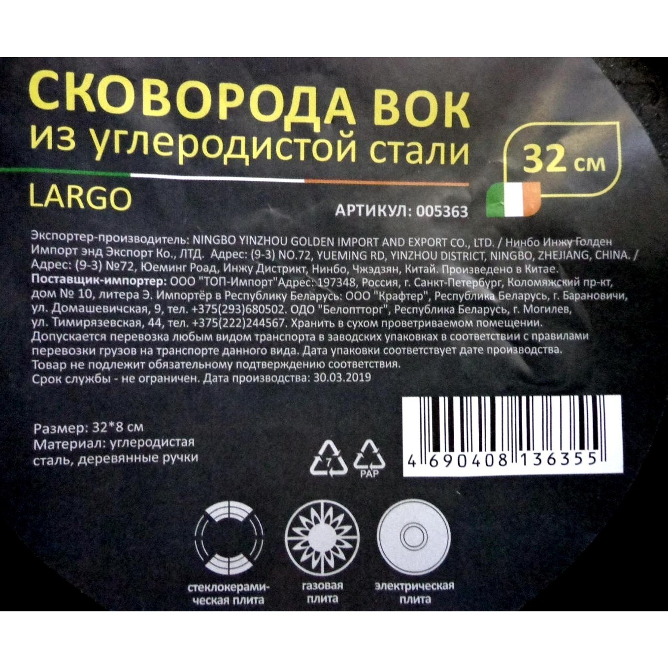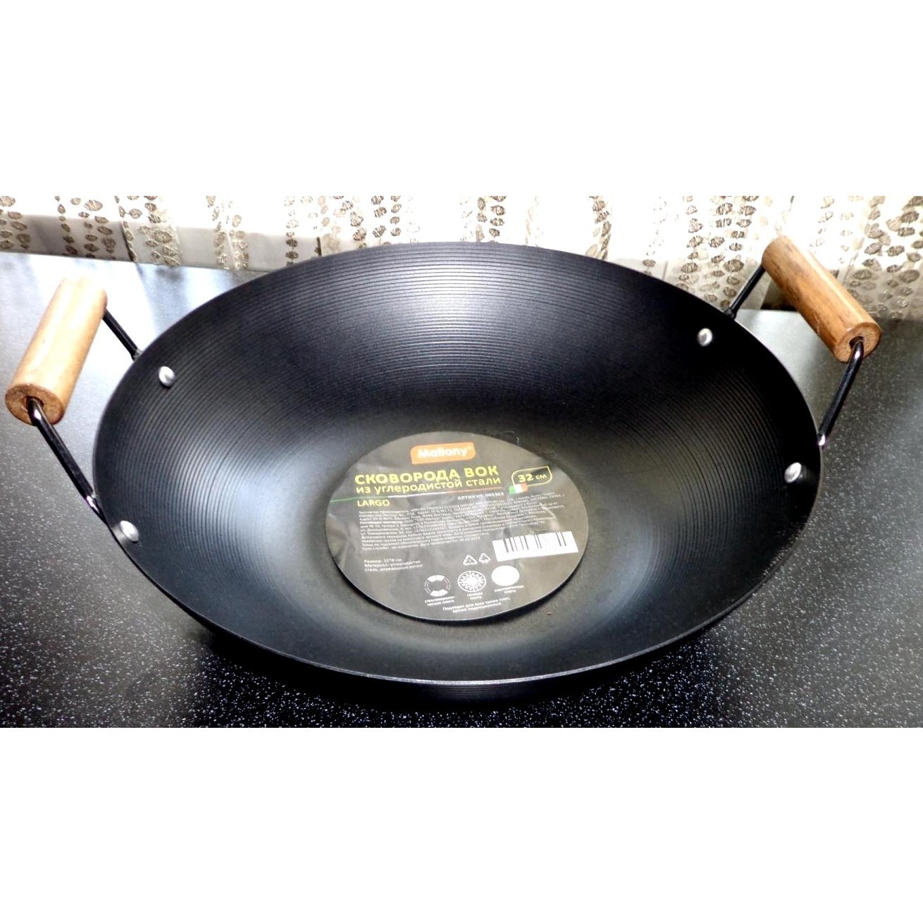 Сковородка от компании Mallony, модель LARGO-32, Тип вок, Максимальный размер 32 см и Толщина стенок 1.2 мм, а также Материал сковороды сталь.
