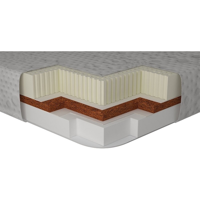 Матрасы от компании Matroluxe, модель Domio Double Comfort 90х190, Тип беспружинный, Жесткость средняя (3) и Количество слоев 5 шт, а также Наполнитель латекс, спанбонд, кокосовая койра, пенополиуретан.