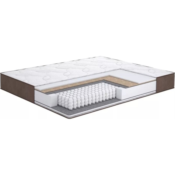 Матрасы от компании Matroluxe, модель Lungo 160x200, Тип пружинный (независимый), Жесткость выше средней / высокая (4/5), двусторонний и Количество слоев 6 шт, а также Наполнитель пена (Air Foam), кокосовая койра, термовойлок.