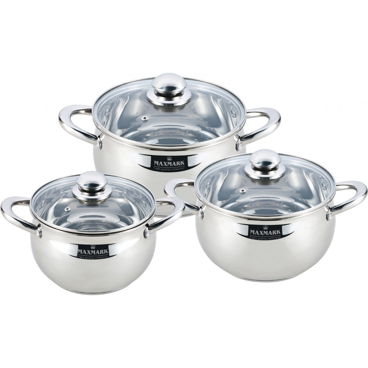 Кастрюля от компании Maxmark, модель MK-APP7506B, Тип набор посуды, Основных предметов 3 шт и Размер 20 см / 22 см / 24 см, а также Объем 3 л / 4 л / 5 л.