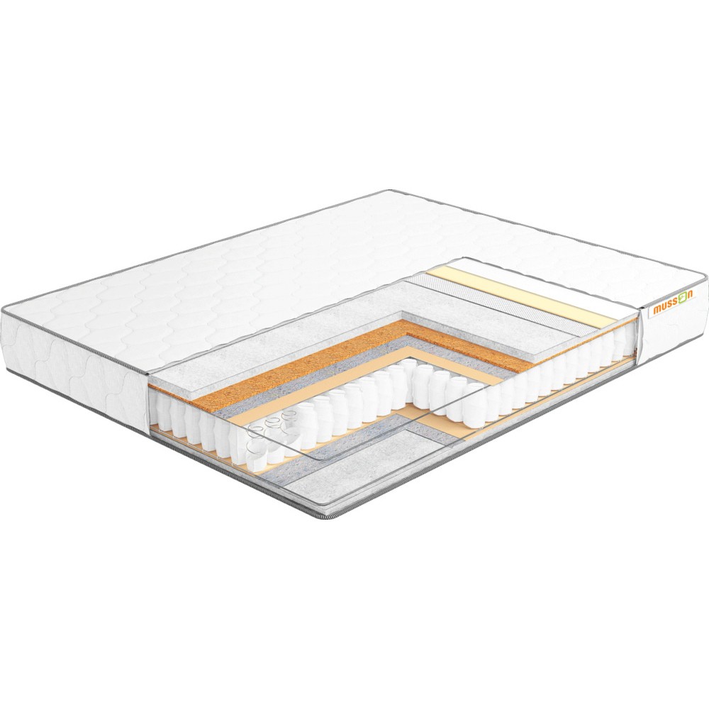 Матрасы от компании Musson, модель Balans Mix 100x100, Тип пружинный (независимый), Жесткость средняя / высокая (двусторонний) и Количество слоев 8 шт, а также Наполнитель флексовойлок, кокосовая койра, термовойлок, спанбонд.