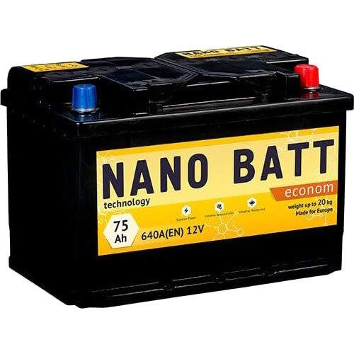 Автоаккумуляторы от компании Nano Batt, модель Econom 75R, Тип стартерный, Назначение авто и Обслуживание необслуживаемый, а также Форм-фактор европейский.