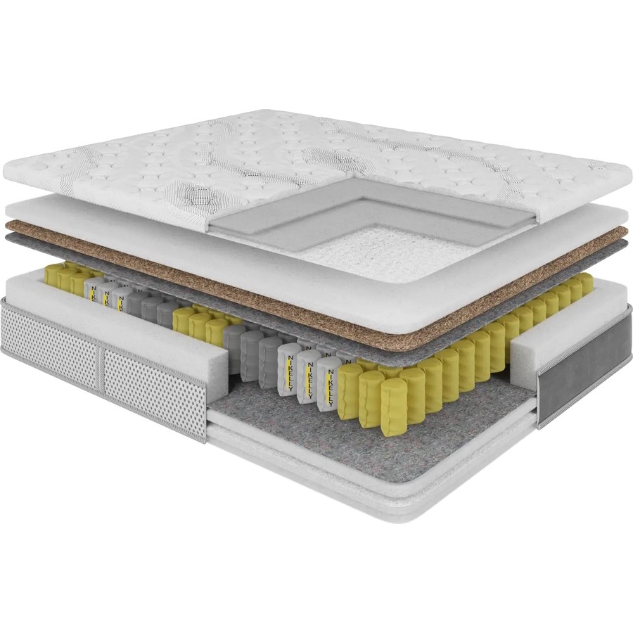 Матрасы от компании Nikelly, модель Etno 180x190, Тип пружинный (независимый), Жесткость средняя / выше средней (3/4), двусторонний и Количество слоев 6 шт, а также Наполнитель пенополиуретан, кокосовая койра, термовойлок.
